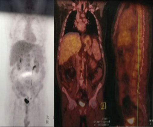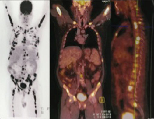 |?Figure. 2? The positron emission tomography-computed tomography shows pathological uptake of radiotracer in bones and left adrenal gland