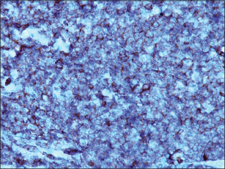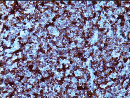 An 18-year-old unmarried girl presented with a 1-month history of lower abdominal pain without fever, loss of weight or appetite, or menstrual irregularity. At a local hospital, computerised tomography imaging showed a large left adnexal mass measuring 10.6 cm × 7.1 cm × 8.2 cm, for which she underwent laparotomy and ovariectomy and came to us for further management. On evaluation, she had an Eastern Cooperative Oncology Group (ECOG) performance status of one with unremarkable general physical and abdominal examination. The ovariectomy specimen reviewed at our center showed high-grade non-Hodgkin's lymphoma (NHL) confirmed as B-lymphoblastic lymphoma by immunohistochemistry [Figure 1], [Figure 2], [Figure 3], [Figure 4], [Figure 5]. The malignant cells were positive for LCA, CD20, C79a, CD10, and TdT and negative for staining with LMO, EMA, CD3, and CD68. The Ki-67 was strongly expressed in over 90% of the cells [Figure 1], [Figure 2], [Figure 3], [Figure 4], [Figure 5]. Serum alpha-fetoprotein (2.09 ng/ml), beta-human chorionic gonadotropin (2.39 mIU/ml), and lactate dehydrogenase levels (381 U/L) were normal. Her baseline hemogram and peripheral smear were normal, and there was no evidence of tumor lysis. Imaging at our center showed no residual tumor in the abdomen. Bone marrow aspiration, bone marrow trephine biopsy, and cerebrospinal fluid analysis were negative for disease involvement. She started systemic therapy as per the Berlin Frankfurt Munster-95 acute lymphoblastic leukemia protocol and remains disease free 2 years after diagnosis.