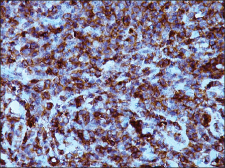 | Figure.4:Atypical cells show positive reaction for CD10 (DAB, ×400)