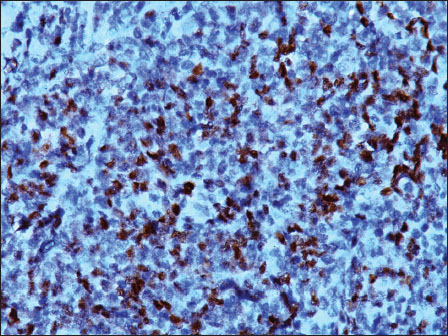 | Figure.3:Atypical cells show positive reaction for CD79a (DAB, ×400)