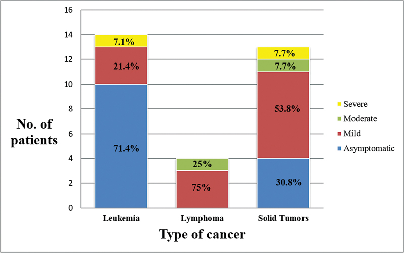 The prevalence of cancer as a comorbidity in admitted pediatric patients with COVID-19 in this study was 15%. Overall, the median age of enrolled children was 5 years with an interquartile range of 2 to 11 years and 58.8% of them were males. The baseline characteristics, COVID-19 disease severity, and outcomes of the enrolled patients are detailed in [Table 1].
