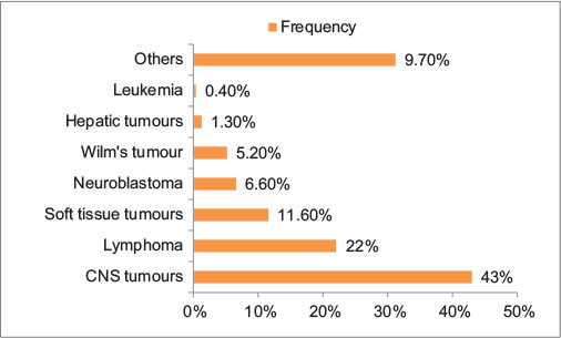 |?Figure. 1? Distribution of different malignances in pediatric population (n = 227)