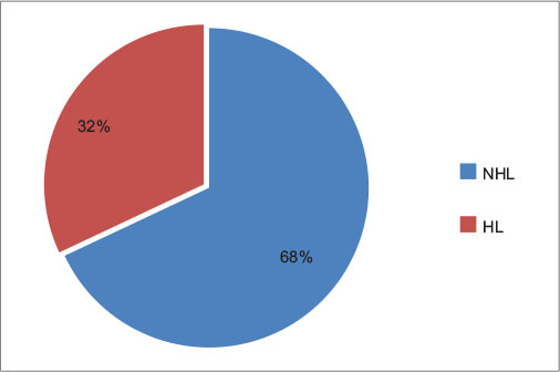 |?Figure. 2? Frequency of Hodgkin?s lymphoma and Non-Hodgkin?s lymphoma. Out of 50 cases of lymphoma, 34 (68%) diagnosed with Non Hodgkin lymphoma