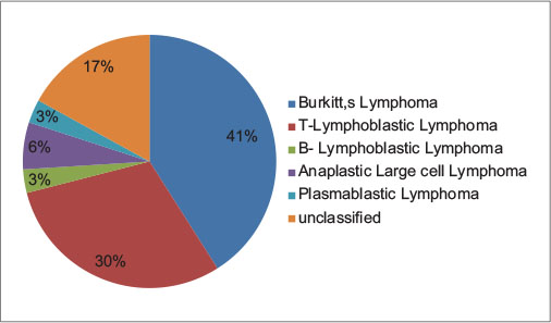 During the study 4302 pediatric cases up to the age of 15 years from the year 2004 to 2013 were retrieved, constituting 5.6% of all. The incidence of pediatric malignancies was 5.2% (227) of all pediatric cases, and incidence of pediatric lymphoma was found to be 22% (50) of all pediatric malignancies [Figure 1]. Among these, central nervous system (CNS) tumors (43%) were the most common followed by lymphoma (22%), of which NHL constitutes 15% (34) cases [Figure 2]. Among NHL, Burkitt?s lymphoma (BL) was the most common 14 cases (41.2%) followed by lymphoblastic lymphoma (LL) 11 cases (32.3%), two cases of anaplastic large-cell lymphoma (ALCL) and one case of plasmablastic lymphoma were reported. Six cases of NHL were unclassified due to unavailability of tissue blocks for further subtyping [Table 1] and [Figure 3].