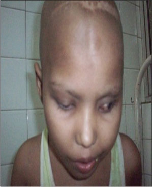 |?Figure. 4? A 6-year-old child with unilateral proptosis, diagnosed with precursor B- lymphoblastic lymphoma on biopsy (LTMMC, Mumbai, India)