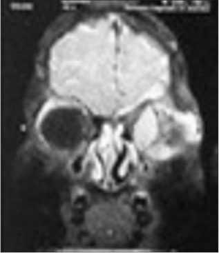 |?Figure. 5? A Magnetic resonance imaging of brain and orbit showed large lobulated intraorbital mass occupying the retrobulbar portion, orbital apex, and extends into cavernous sinus, c/o precursor B- lymphoblastic lymphoma