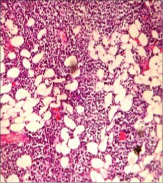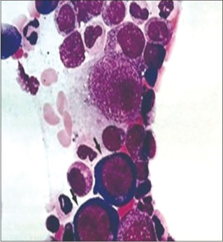 Bone marrow aspirate showed erythroblastopenia with giant pronormoblast with 14% lymphomonocytoid cells suggestive of parvovirus infection [Figure 9]. The patient was detected with raised titers of immunoglobulin M parvovirus antibodies and diagnosis was confirmed with serology.