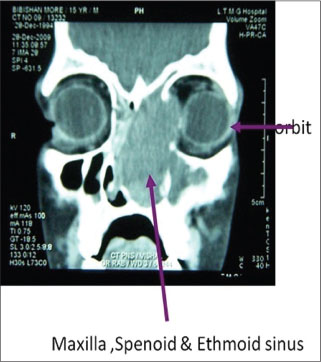 A 14-year-old male child presented with left side nasal obstruction for 3 months with epistaxis, 3?4 episodes. CT skull and nasal cavity showed soft-tissue lesion involving left nasal cavity extending into maxilla, sphenoid and ethmoid sinus, and sparing left orbit. Resection of the mass was done [Figure 7].