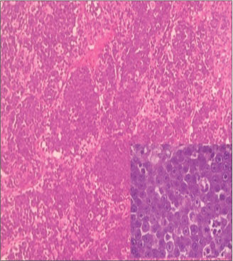 Resection of the mass was done. Intraoperatively tumor was well circumscribed, not involving the optic nerve. Histopathological examination showed bits of tumor tissue showing diffuse dense monomorphous proliferation of lymphoid cells, infiltrating in the orbital soft tissue and muscle, and tumor cells were medium-sized lymphoid cells with thin nuclear membrane, delicate chromatin, indistinct nucleoli, brisk mitoses, and scant cytoplasm. On immunohistochemistry, tumor cells were negative for desmin, mic2, MPO, and synaptophysin and positive for LCA, CD20 and Tdt [Figure 6].