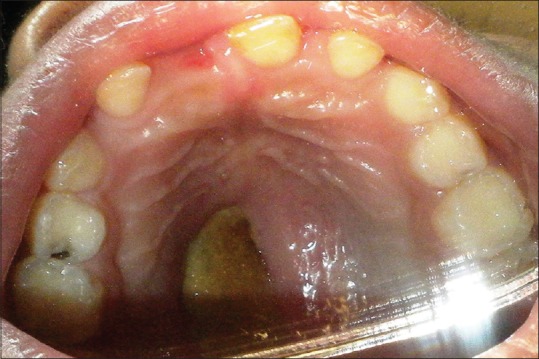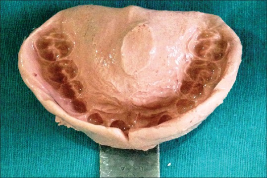 A 6-year-old boy, case of ALL, was referred for prosthetic rehabilitation of a palatal perforation following chemotherapy [Figure 1]. A detailed case history revealed that the patient was diagnosed with B-cell ALL at the age of 5 years and was on consolidation chemotherapy. Palatal biopsy showed hyperplastic ulcerated squamous epithelium admixed with scanty bony bits and necroinflammatory cells with underlying granulation tissue. Ulcer slough contained a few fungal hyphae suggestive of secondary colonization. Noncontrast computerized tomography scan revealed mucosal pansinusitis and rhinitis. Nasal secretion test for fungal identification and susceptibility testing showed the presence of Candida tropicalis. On oral examination, a 2 cm × 2 cm perforation was seen on the left side of the hard palate with slough. It was decided to make a palatal obturator to cover the palatal perforation. This defect in the palate led to difficulty in eating, swallowing, and nasal regurgitation. Speech too was hypernasal and not intelligible. It was decided to cover the palatal perforation by fabrication of a palatal obturator.