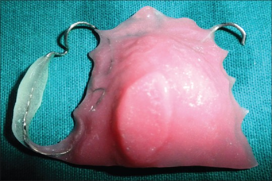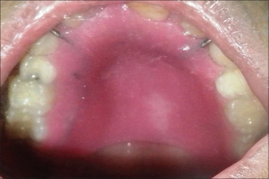 A stainless steel stock dentulous tray and irreversible hydrocolloid (Dentalgin; Prime Dental Products, Mumbai, India) were used to record preliminary impression of the maxillary arch [Figure 2]. Mandibular impression was also made with irreversible hydrocolloid. Stone (Kaldent Dental Stone Class III, Kalabhai Karson Pvt. Ltd.) working cast were obtained from the impression. A 19-gauge hard, round, stainless steel orthodontic wire (KC Smith and Co., Monmouth, UK) was used to fabricate the full wire clasp and C clasps for the palatal obturator as shown in figure. A single thickness modeling wax was adapted on the maxillary cast covering entire hard palate and subsequently acrylized into the heat-polymerized acrylic resin (DPI Dentsply, India). The prosthesis was finished and polished in usual manner [Figure 3]. The prosthesis was delivered, and postinsertion instructions were given to the patient regarding hygiene maintenance in the oral cavity [Figure 4]. It was observed that the patient was very comfortable using this removable prosthesis which obturated the palatal defect. This palatal obturator facilitated eating and swallowing. The patient could also comfortably communicate as the speech could be understood by the listeners. The patient was followed up at regular interval. This option of prosthetic obturation of the palatal defect was preferred over surgical closure in view of the medical history and general condition of the patient.