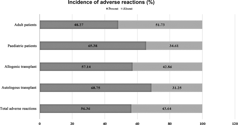 Results The present study included 55 transplant patients, and the commonest diagnosis was Hodgkin lymphoma. All were prophylactically hydrated and premedicated as per institutional protocol. AR was seen in 56.36%, (n = 31); the commonest type of ARs was nausea (n = 26) followed by vomiting (n = 13), abdominal pain (n = 4), shivering (n = 3), transient tachycardia (n = 2), transient hypotension (n = 2), and hematuria (n = 1). All ARs were managed clinically by giving symptomatic treatment. No patients required intensive care, and there were no deaths or aborted procedures. Characteristics of infusion products had no significant correlation to ARs.