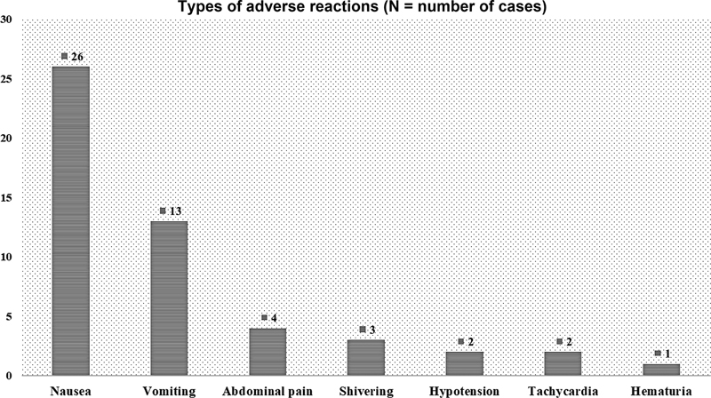 50.98%, (n = 26) nausea 25.49%, (n = 13) vomiting 7.84%, (n = 4) abdominal pain 5.88%, (n = 3) shivering 3.92%, (n = 2) transient tachycardia 3.92%, (n = 2) transient hypotension 1.96%, (n = 1) hematuria |