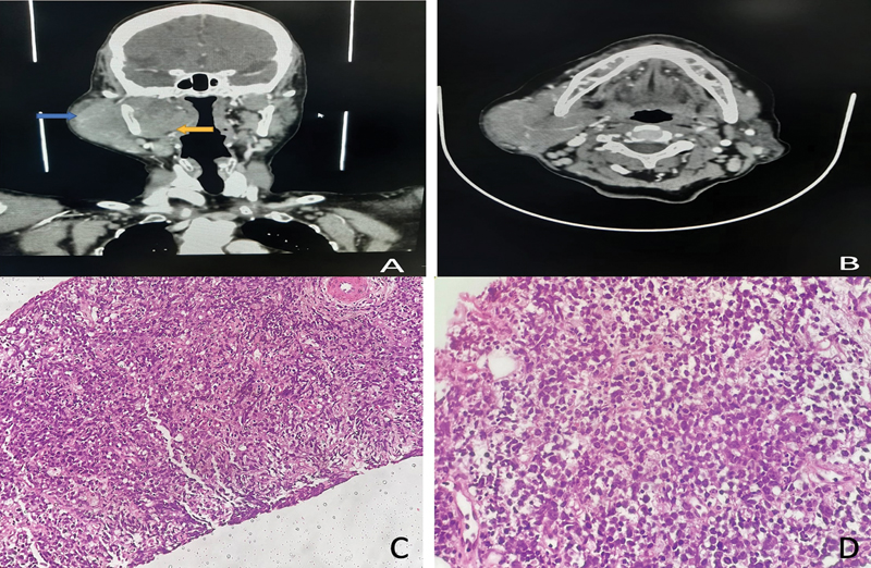 Fig 1: (A and B) Computed tomography of the neck with contrast showing an ill-defined homogeneously enhancing soft tissue density involving the superficial lobe (blue arrow) and deep lobe (yellow arrow) of the right parotid gland with extensions. (C and D) Hematoxylin and eosin-stained sections in 20× (C) and 40× (D) magnifications, respectively, showing infiltration by sheets of atypical large lymphoid cells, with the presence of brisk mitosis and apoptosis.