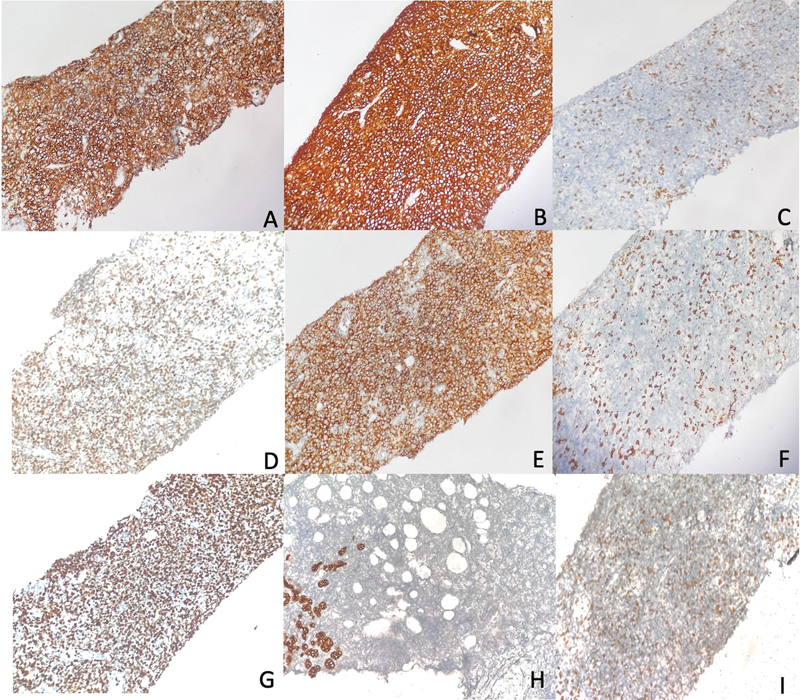 Fig 2: Immunohistochemical findings in the tumor cells in 20 × : (A) CD45 positive in the tumor, (B) CD20 diffusely positive in the tumor cells, (C) CD3 scattered positivity noted, (D) Bcl6 positive, (E) Bcl2 diffusely positive, (F) CD5 positive in scattered cells, (G) Ki67 80%. in the tumor cells, (H) cytokeratin positive in entrapped glands and negative in tumor cells, and (I) C-myc focally positive.