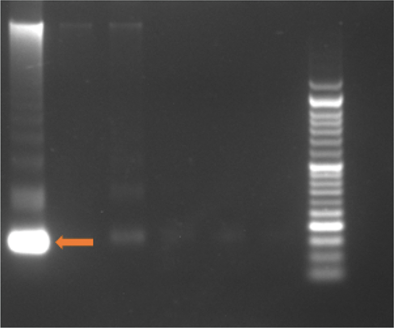 | | Fig 1Representation of gel electrophoresis of cfDNA. Arrow indicating cfDNA with a molecular weight of 170 kb. cfDNA, cell-free DNA.|