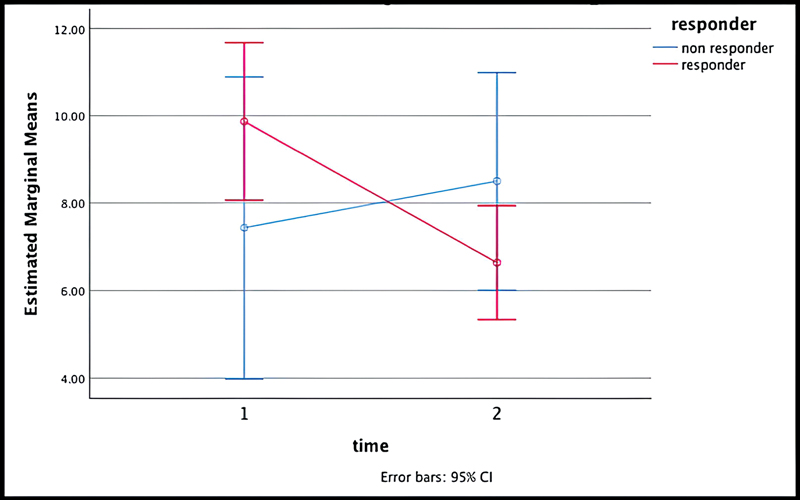 | Fig 3Repeated measures test showing difference in cfDNA levels with time in the patients who had a response (red) versus no response (blue). The difference was statistically significant (p = 0.035). cfDNA, cell-free DNA; CI, confidence interval.|