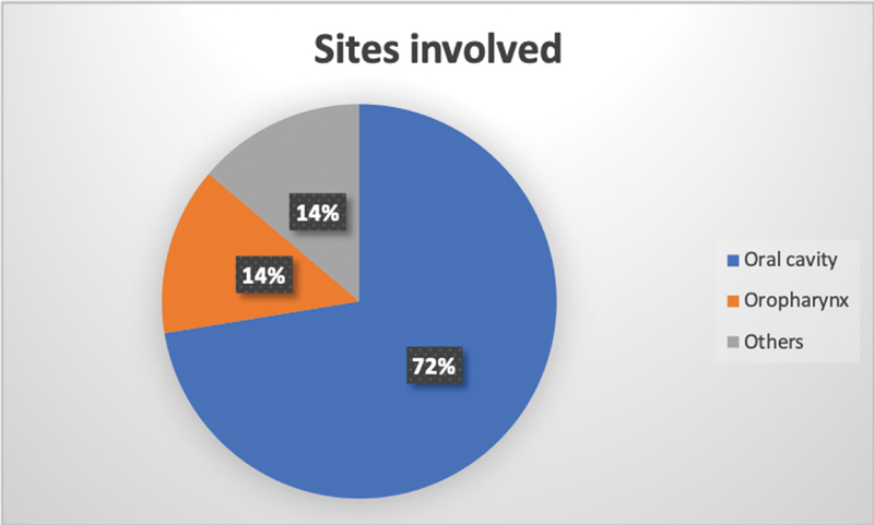 The patients presented with a high volume of disease, characterized by swelling and ulceration (79%), followed by significant lymph node enlargement (17%). The differences in baseline cfDNA levels based on the site of origin were compared. The mean reading was higher for the tumors arising from the oral cavity (buccal mucosa predominantly) amounting to 9.39 ± 4.87 ng/µL ([Fig. 6], [Table 3]). Also, the exposure to radiotherapy as part of the concurrent chemoradiotherapy protocol was associated with lower cfDNA levels (7.59 ± 2.84 ng/µL) when compared with those who did not (11.61 ± 5.1 ng/µL) ([Table 4]).