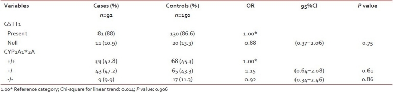 The glutathione S transferase (GST) family (phase II drug-metabolizing enzymes) is involved in the metabolism of a wide range of chemicals including environmental carcinogens, reactive oxygen species, and chemotherapeutic agents.[3] Four different gene families of GSTs (cytosolic enzymes) are known, namely α, μ, π, and θ, which have different but often overlapping substrate specificities.[4] Polymorphism in GST genes lead to either decreased activity of the enzyme or complete loss of enzyme activity. The most common variant of the GSTM1 and GSTT1 genes is homozygous deletion (null genotype), which has been associated with the loss of the enzyme activity.[5] GSTM1 activity is absent in about 40% to 60% of the Caucasian population and 20% to 30% of Caucasians show absence of GSTT1 activity.[6] GSTP1 (Ile105val) single nucleotide polymorphism affects substrate specific catalytic activity of the enzyme and its thermal stability.[6–8] Cytochrome P-450 (CYP) 1A1 is a key enzyme in phase I bioactivation of xenobiotics and its polymorphism is associated with elevated enzymatic activity.[9,10]