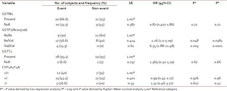 Distribution of GSTM1, GSTT1, GSTP1 (rs1695) and CYP1A1 polymorphisms among the patients with and without event and its association with clinical outcome by univariate analysis
