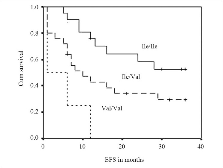 The frequencies of genotypes among patients with event and without event are presented in Table 2. Kaplan–Meier survival analysis was performed for the genotypes and log-rank P values were derived. GSTP1 (Ile/Val) and GSTP1 (Val/Val) genotypes were significantly associated with the outcome of the patient (log rank P=0.038 and 0.0001, respectively). Survival curves of ALL patients with GSTP1(Ile105val) polymorphism were shown in Figure 1. Cox regression analysis showed GSTP1 polymorphism as an independent prognostic factor associated with 6-fold increased risk with Val/Val genotype and 2-fold increased risk with Ile/Val genotype [Table 2]. Of the 5 patients who had induction failure, 3 patients had GSTP1 (Ile/Val) and 2 had GSTP1 (Val/Val) genotype. GSTM1 (present/null), GSTT1 (present/null) and CYP1A1*2A polymorphism did not reveal any prognostic significance.