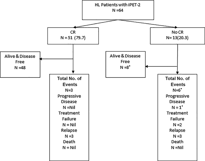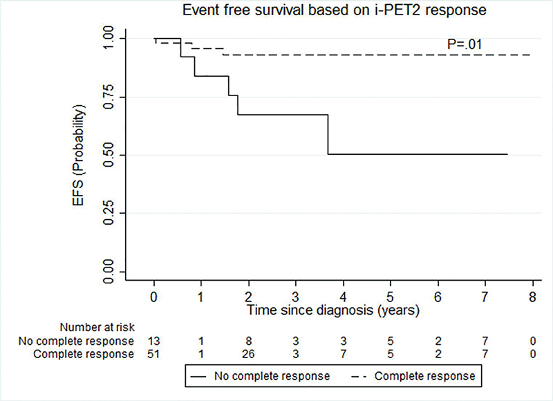 In our study, patients not achieving CR in the iPET2 scan had five times increased risk of an adverse outcome when compared with patients achieving CR. Results from sev
