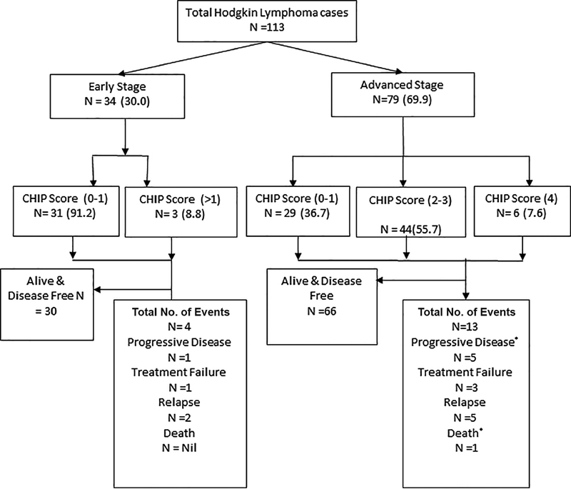 |?Fig. 2?Flowchart depicting the outcome of all pHL patients treated in 11 primary centers across South India (2009?2019).Abbreviation: pHL, pediatric Hodgkin lymphoma. *One patient died due to progressive disease, so the event is taken as a progressive disease for analysis.