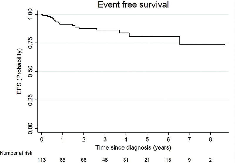 |?Fig. 3?Event-free survival of pHL patients treated in 11 primary centers across South India (2009?2019): (n = 113). pHL, pediatric Hodgkin lymphoma.|