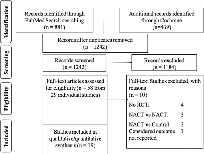 The study objective is furcated on the basis of PICOD criteria. For each of the section except outcome (e.g., (i) breast cancer, (ii) NACT, (iii) ACT, and (iv) RCTs), search terms were identified as the synonyms of these words. Synonyms of specific section were joined by “OR” operator; however, different sections were joined by “AND” operator. The detailed search strategies for PubMed as well as Cochrane Register of Controlled Trials are given in Appendix S1 – electronic search strategy.
