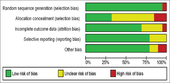 The risk-of-bias assessment of RCTs was done using the Cochrane Collaboration's tool for assessing the risk of bias.[14] It was performed under the key domains namely random sequence generation and allocation concealment for selection bias; incomplete outcome data (attrition bias); selective reporting of outcome (reporting bias); and other biases including publication bias. All the risk biases were assessed at study level.