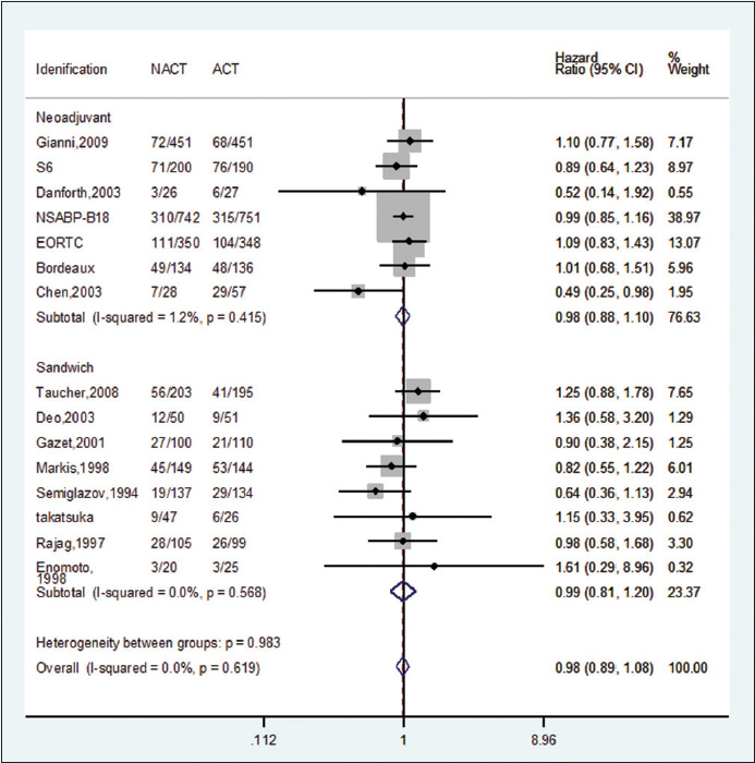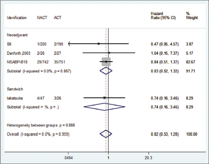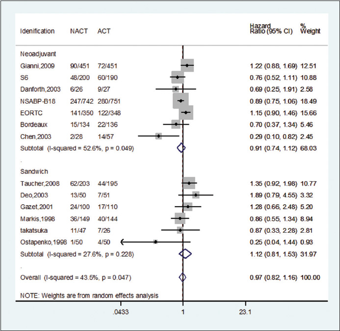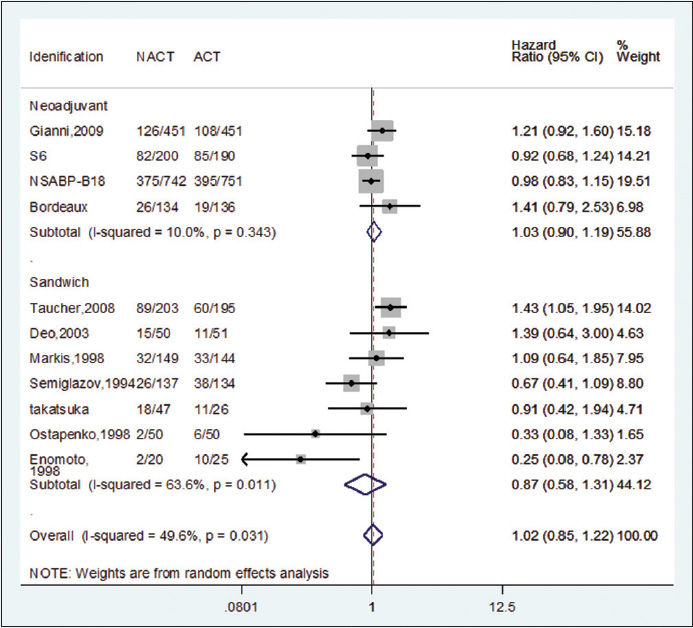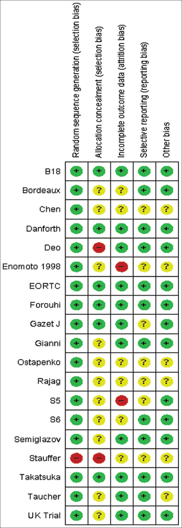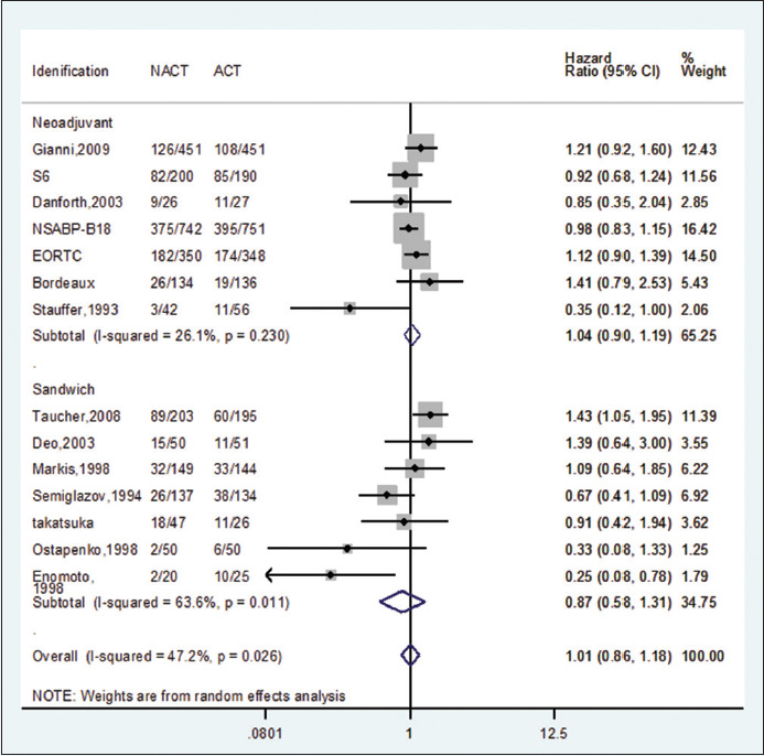 A number of randomized controlled trials (RCTs) have reported a beneficial effect of NACT regarding OS, DFS, and BCS.[1],[2],[3],[4],[5] However, some other RCTs have reported contradictory findings.[6],[7] In view of such mixed reporting and implications of large-scale use of NACT at global level, there is a need to critically analyze the benefits of NACT among breast cancer patients.