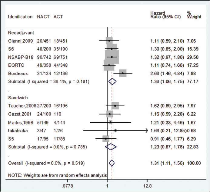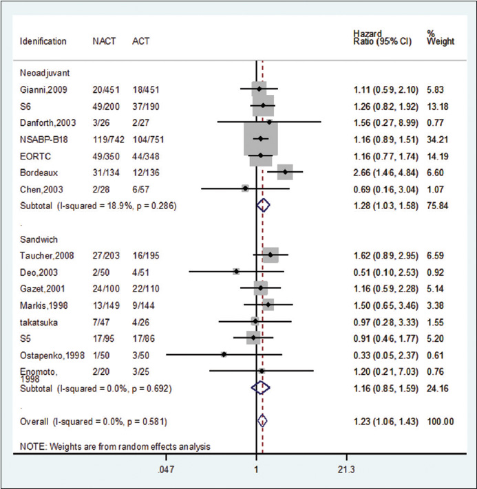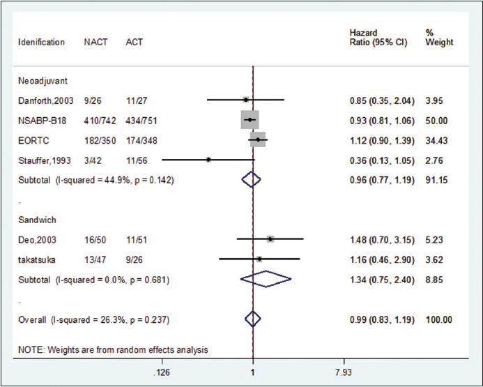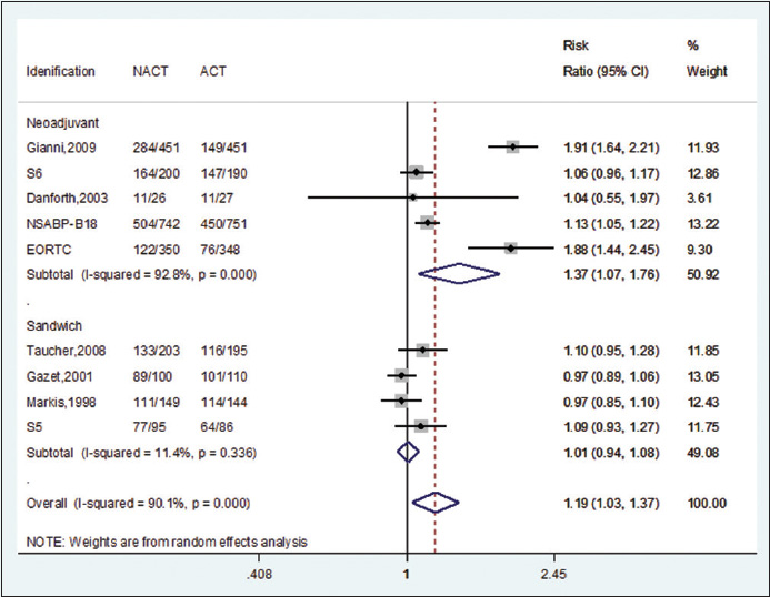 As most of the trials have included participants of early as well as LABC, stage-wise meta-analysis (as committed during PROSPERO registration) was not feasible. Subgroup analyses on the basis of type of intervention, i.e., total NACT versus ACT or sandwich NACT (NACT + ACT) versus ACT, were also performed for all of the outcomes. Sensitivity analyses excluding the trials where surgery was omitted for the patients having complete response were also performed for all the outcomes.