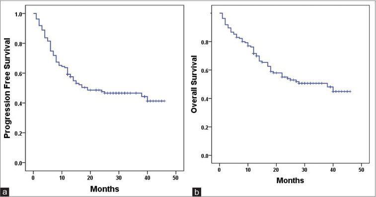 The demographic and disease characteristics of these patients are shown in [Table 1]. The median age at presentation was 58 years (range: 18–82 years) with a preponderance of male (M:F = 2.5:1) patients. The mean duration of symptoms before being diagnosed as DLBCL at our center was 56.4 ± 42.3 days. Of the eligible 135 patients in the study, 89 (65.9%) had B-symptoms, 20 (14.8%) had bulky disease, 79 (58.5%) had advanced disease (Stage III and IV) at presentation, and 29 (21.5%) had primary extranodal involvement. Serum albumin <3>