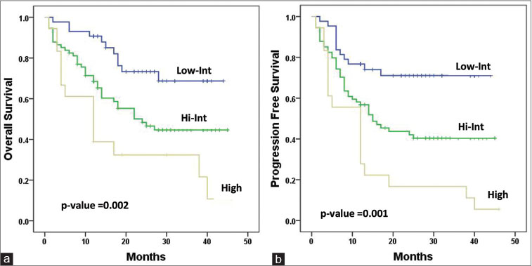 For around two decades, the International Prognostic Index (IPI) derived from five prognostic factors, such as age, Ann Arbor tumor stage, serum lactate dehydrogenase (LDH) level, Eastern Cooperative Oncology Group (ECOG) performance status, and number of extranodal sites involved, holds its prognostic significance in discriminating patients with aggressive lymphomas into four discrete outcome groups with a 5-year overall survival (OS) ranging from 26% to 73% even in the postrituximab era.[2] [3] However, one potential limitation to the use of the original IPI in patients receiving rituximab is that the difference in outcomes between patients in different IPI-risk groups is relatively small. Several prognostic models have been developed since then to improvise the IPI prognostic model using the same prognostic factors in a more detailed way to provide better discrimination between risk groups.[4] One such prognostic model is the National Comprehensive Cancer Network-IPI (NCCN-IPI) that provided better discrimination between risk groups with OS ranging from 38% to 96%.[5]