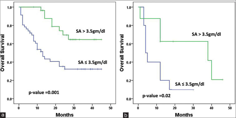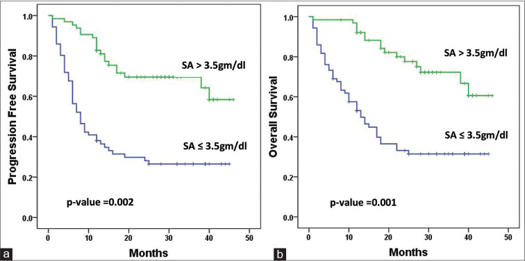 | Figure 3 Progression-free survival stratified according to serum albumin and (b) overall survival stratified according to serum albumin