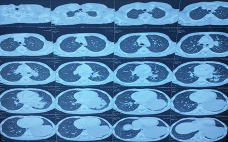 | Fig 1 : Contrast-enhanced computed tomography of the chest showing an enlarged mass in the lower left lung.
