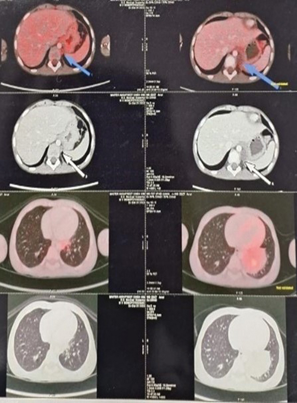 During childhood, lung and endobronchial cancers make up a very small percentage of all pediatric malignancies.[4] The different types of lung cancer found in children are quite varied, and one of the rarer forms is SCLC, which makes up approximately 4.5%-of cases.[5] Only a small number of patients receive a diagnosis at an early stage, while the majority have an advanced-stage disease, which unfortunately has a very grim prognosis, with a survival rate of less than 5%-after 2 years.[6] [7] [8] Here is the case summary of an 8-year-old boy who received extensive-stage SCLC diagnosis and underwent investigative workup and treatment at our center.