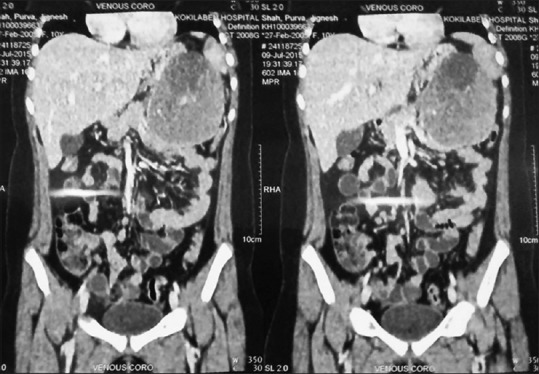 An ultrasound of the abdomen revealed a large mass in the lesser sac. A computed tomography scan of the abdomen showed a large heterogeneous mass, partly solid, and partly cystic in nature occupying the entire lesser sac abutting the pancreas and the spleen [Figure 1]. The left kidney and the stomach were in proximity but not affected. The mass showed a well-defined margin, but the organ of origin could not be conclusively determined.