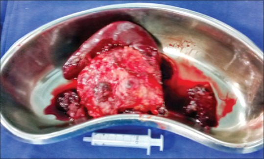 On exploratory laparotomy, a large mass was found in the lesser sac densely adherent to the pancreas and the spleen with splenic artery thrombosis. Excision of the mass [Figure 2] along with distal pancreatectomy and splenectomy was done. The postoperative course was uneventful, and the patient is doing well on follow-up.