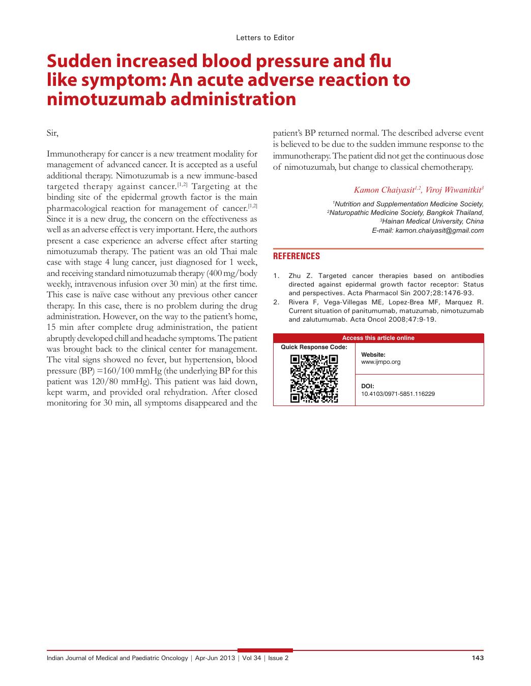 Sudden increased blood pressure and flu like symptom: An acute adverse reaction to nimotuzumab administration