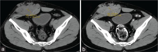 | Figure 2: Computed axial tomography of abdomen - plain (a) and contrast (b) showing well-definedsolid mass with lobulated outlines in the right iliac fossa and hypogastric region in subcutaneous plane causing extrinsic compression and posterior displacement of abdominal wall muscles appearing slightly hypodense on plain study (a) showing heterogeneous enhancement in contrast (b)