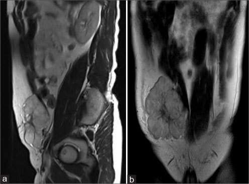 | Figure 4: Magnetic resonance imaging of the abdomen - sagittal T2 (a), coronal T2 (b) showing well-definedsolid mass with lobulated outlines in the right iliac fossa and hypogastric region in subcutaneous plane causing extrinsic compression and posterior displacement of abdominal wall muscles appearing hyperintense on T2-weighted image
