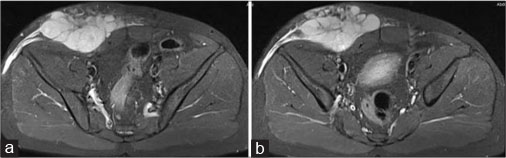 | Figure 5: Magnetic resonance imaging of the abdomen - axial short tau inversion recovery (a and b) showing well-definedhyperintense solid mass with lobulated outlines in the right iliac fossa and hypogastric region in subcutaneous plane causing extrinsic compression and posterior displacement of the abdominal wall muscles