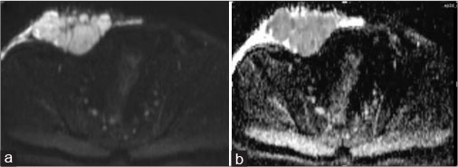 | Figure 6: Magnetic resonance imaging of the abdomen - axial diffusion-weighted imaging (a), apparent diffusion coefficien (b) showing restricted diffusion on diffusion-weighted imaging with low apparent diffusion coefficient value
