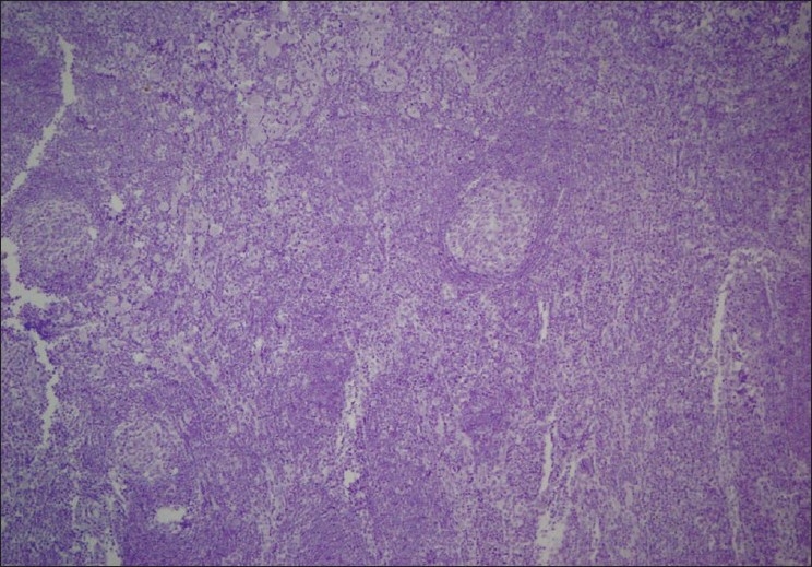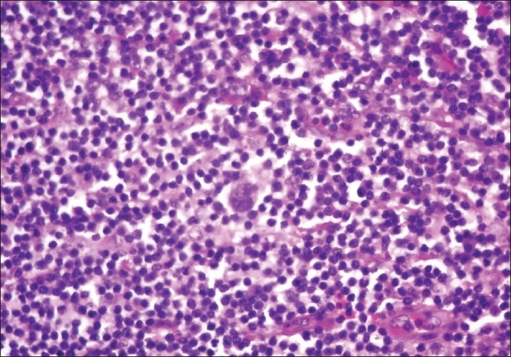 HHV-8-positive cases are associated with a different morphology than HHV-8-negative cases.[2] HHV-8-negative cases have enlarged, active, hyperplastic follicular centers with mitoses, macrophages with nuclear debris, and increased follicular dendritic cells. There is usually a thin but distinct mantle zone. HHV-8-positive PCD cases have follicles that show severe hemorrhage and lysis with dissolution of the germinal center. The mantle zone-interfollicular area boundary is obliterated with the presence of indistinct, irregular mantle zones. Additionally, HHV-8-positive cases are more likely to have plasma cell atypia with immunoblasts and plasmablasts present in the mantle zones and more pronounced vascular proliferation in the interfollicular areas. There is also intranodal sinus dilatation which is absent in HHV-8-negative cases.[2] All three of the patients in our series had a morphology consistent with the HHV-8-negative type of PCD.