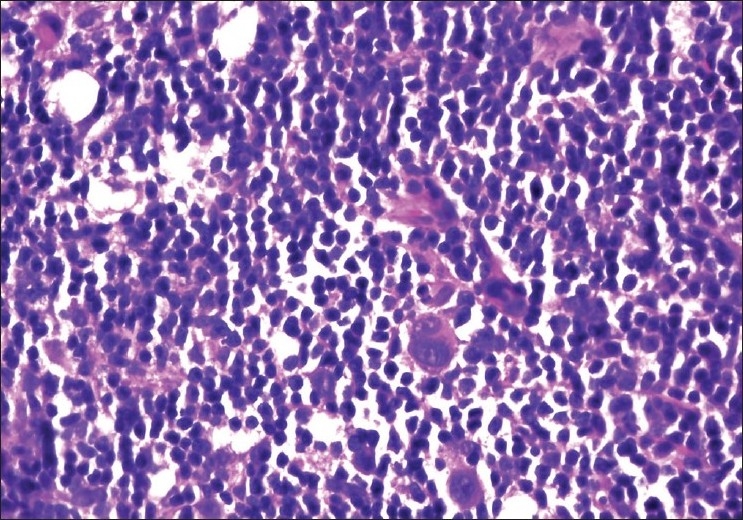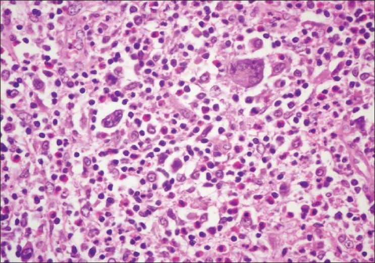 It has been suggested that CD should be divided into primary and secondary, with secondary being associated with conditions that result in an IL-6-rich environment.[10–12] This would include HIV, autoimmune disorders, and plasma cell dyscrasias. It has also been shown that Reed-Sternberg cells and mononuclear-variant cells produce IL-6.[11]One report says of 19 cases with both HL and CD, that the diagnosis of Hodgkin's disease was delayed in 16 cases.[3] The Castleman-like changes induced by IL-6 can make it harder for the pathologist to recognize the diagnostic Reed-Sternberg cells, and consequently, the diagnosis of a very treatable disease may then be missed.[3–7] Our series included one case (case 1) of interfollicular HL that was diagnosed concurrently in a mediastinal lymph node. Another case (case 3) presented concurrently with nodular sclerosing HL in the thymus and PCD in a mediastinal node. The most unusual in our series was the case 2 who presented with mixed cellularity HL first, and then 16 months later (10 months postchemotherapy induced remission) returned with PCD. To our knowledge, this is the first case of its kind.