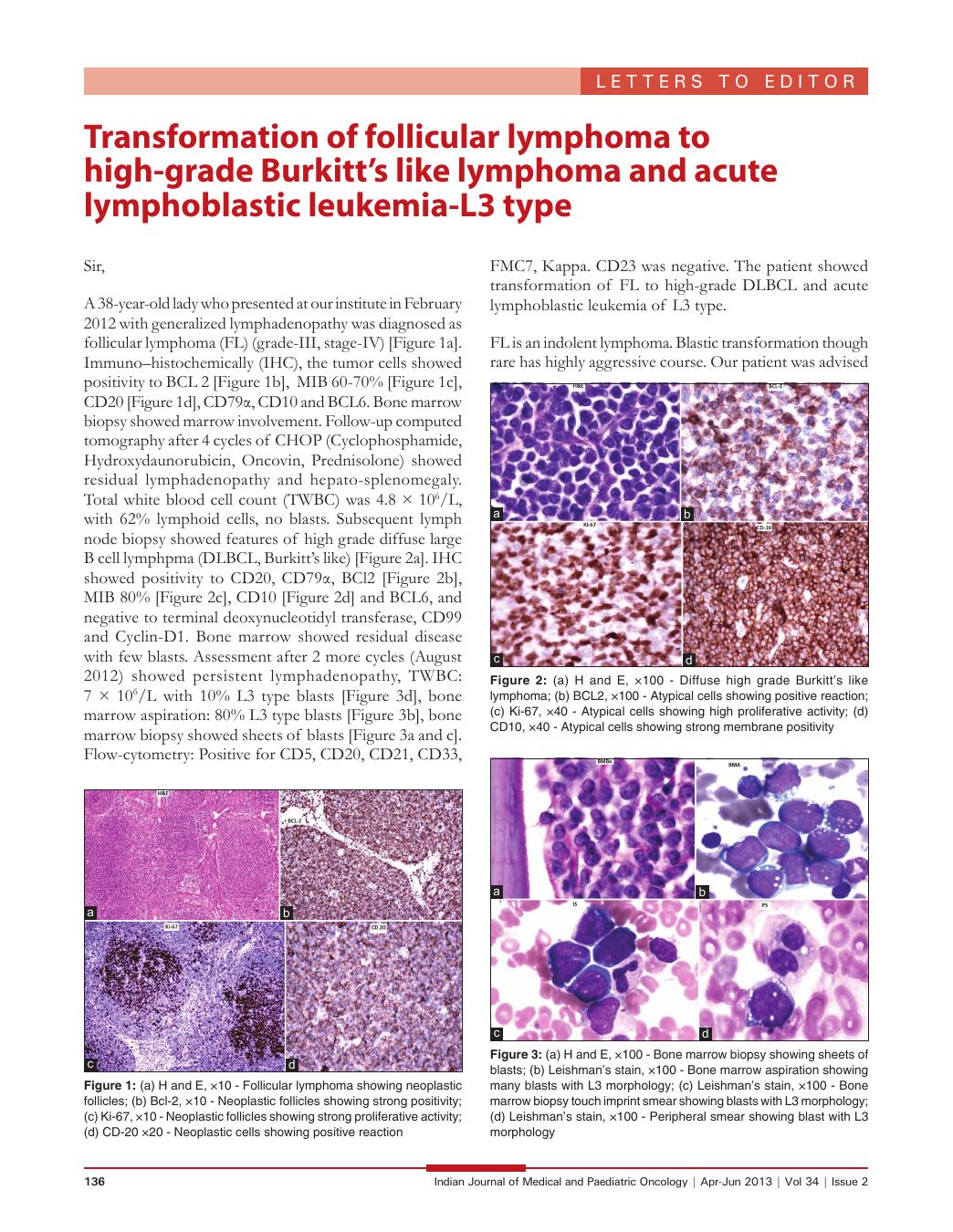 A 38-year-old lady who presented at our institute in February 2012 with generalized lymphadenopathy was diagnosed as follicular lymphoma (FL) (grade-III, stage-IV) [Figure 1a]. Immuno–histochemically (IHC), the tumor cells showed positivity to BCL 2 [Figure 1b], MIB 60-70% [Figure 1c], CD20 [Figure 1d], CD79α, CD10 and BCL6. Bone marrow biopsy showed marrow involvement. Follow-up computed tomography after 4 cycles of CHOP (Cyclophosphamide, Hydroxydaunorubicin, Oncovin, Prednisolone) showed residual lymphadenopathy and hepato-splenomegaly. Total white blood cell count (TWBC) was 4.8 × 106/L, with 62% lymphoid cells, no blasts. Subsequent lymph node biopsy showed features of high grade diffuse large B cell lymphpma (DLBCL, Burkitt's like) [Figure 2a]. IHC showed positivity to CD20, CD79α, BCl2 [Figure 2b], MIB 80% [Figure 2c], CD10 [Figure 2d] and BCL6, and negative to terminal deoxynucleotidyl transferase, CD99 and Cyclin-D1. Bone marrow showed residual disease with few blasts. Assessment after 2 more cycles (August 2012) showed persistent lymphadenopathy, TWBC: 7 × 106/L with 10% L3 type blasts [Figure 3d], bone marrow aspiration: 80% L3 type blasts [Figure 3b], bone marrow biopsy showed sheets of blasts [Figure [Figure3a3a and andc].c]. Flow-cytometry: Positive for CD5, CD20, CD21, CD33, FMC7, Kappa. CD23 was negative. The patient showed transformation of FL to high-grade DLBCL and acute lymphoblastic leukemia of L3 type.