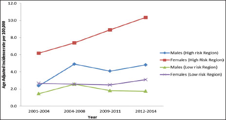 We divided Indian states and territories into high- and low-risk regions using incidence rates extracted from the PBCRs. States were considered to be in the high-risk region if PBCR existing in the state observed average AARs of >5.0 per 100,000 persons.[2] Others were considered as low-risk regions. According to the definition, Cachar, Delhi, Kamrup, Dibrugarh, Kolkata, and Sikkim were in the high-risk region, and the rest of the registries were considered to be in the low-risk region. For comparison, average AARs of all registries from high- and low-risk regions were taken for four time periods (2001–2004 to 2012–2014).