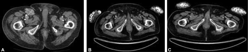 |?Fig. 1Computed tomography (CT) showing (A) right pelvic lymphadenopathy at diagnosis in July 2017; (B) positron emission tomography computed tomography (PET/CT) restaging September 2017 postradiotherapy showing a partial response; (C) PET/CT September 2018 showing a complete response to avelumab.