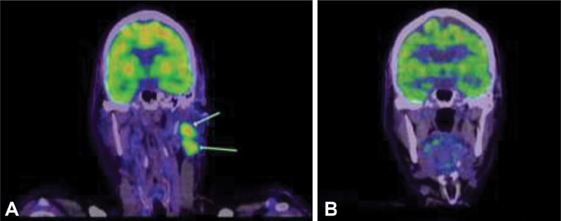 |?Fig. 1Positron emission tomography (PET) scans showing (A) 18-fluoro-2-deoxy-glucose avid left cervical lymphadenopathy at diagnosis of metastatic Merkel cell carcinoma in July 2018; (B) complete resolution of cervical lymphadenopathy in April 2019 following 5 months of treatment with second-line avelumab.